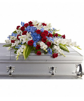 This vibrant casket spray features red, white, and blue flowers that show your affection and appreciation towards the departed soul. It includes stunning hydrangea, roses, miniature, snapdragons, chrysanthemums, and more.